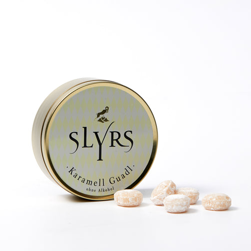 Guadl, Karamellbonbons von Slyrs - Das feine Slyrs-Whisky-Aroma lässt sich auch in fester Form genießen – mit Butterkaramell-Geschmack und ohne Alkohol. Die Guadl (bayerisch für Bonbon) in der dekorativen runden Blechdose passen wunderbar in die Jacken- oder Handtasche, eine alkoholfreie Whisky-Freude für unterwegs. (200 g)