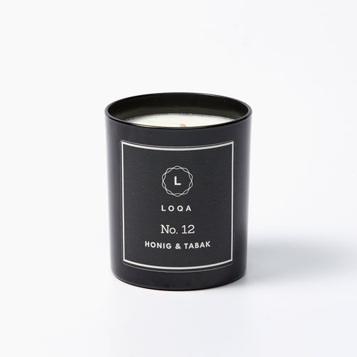 Duftkerze No.12 Honig & Tabak von LOQA - Wenn die No. 12 brennt, zieht ein tiefes Wohlgefühl auf. Denn Düfte beeinflussen unsere Stimmung, wecken Erinnerungen – hier sind es kräftige Tabak- und sinnliche Honignoten... Und weil die Duftkerze aus der Manufaktur LOQA aus Sojawachs gefertigt ist, brennt sie sauberer und langsamer als herkömmliche Kerzen. Auch das gibt ein gutes Gefühl! (190 g, bis zu 30 Stunden Brenndauer)