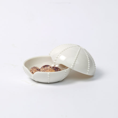 Seeigel-Dose von Keramikmeisterin Sophia Weiss - Streicheln erlaubt! Dieser Seeigel pikst nicht, sein feines Punktemuster erzählt vielmehr von seiner besonderen Machart: aus feinem Porzellan frei gedreht, wird die Dose anschließend von Hand verziert. Das beeindruckend symmetrische Dekor tupft die Keramikmeisterin mittels Malbällchen auf. So wird aus einer schlichten Dose ein Seeigel und ein Kunstobjekt, das als Salzgefäß, Schmuckdöschen oder Vase Furore macht. (Durchmesser ca. 7 cm, Höhe ca. 6 cm, spülmaschinenfest)