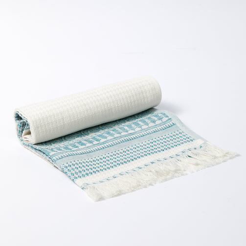 Handtuch Messina von Leitner Leinen - Das Waffelmuster mit seiner weichen, hautfreundlichen Struktur ist längst ein Klassiker. Doch dieses Pikee-Handtuch hat einen Twist: Es ist aus Halbleinen gewebt und mit Jacquardbordüren verziert, Säulen und Bögen erinnern an südliche Gefilde. Hergestellt in der Traditionsweberei Leitner Leinen in Oberösterreich, doch in der Ausstrahlung äußerst mediterran. (50 x 100 cm)