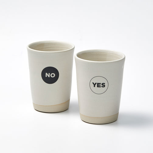 Becher mit Ansage von Hantwerck, Alexa Voigtlaender - Nicht selten ist ein kleines Signal die einfachste Lösung. Deshalb hält der moderne Keramikbecher auf humorvolle Weise unterschiedliche Aussagen für alle und jede Situation bereit. Erschaffen wurde der Becher von Alexa Voigtlaender von Hand und in limitierter Auflage. Auch bei Abstimmungen und Entscheidungen könnte er eine Hilfe sein – ein unschlüssiges „Ich weiß nicht“ ist damit jedenfalls keine Option. (Höhe 11 cm)